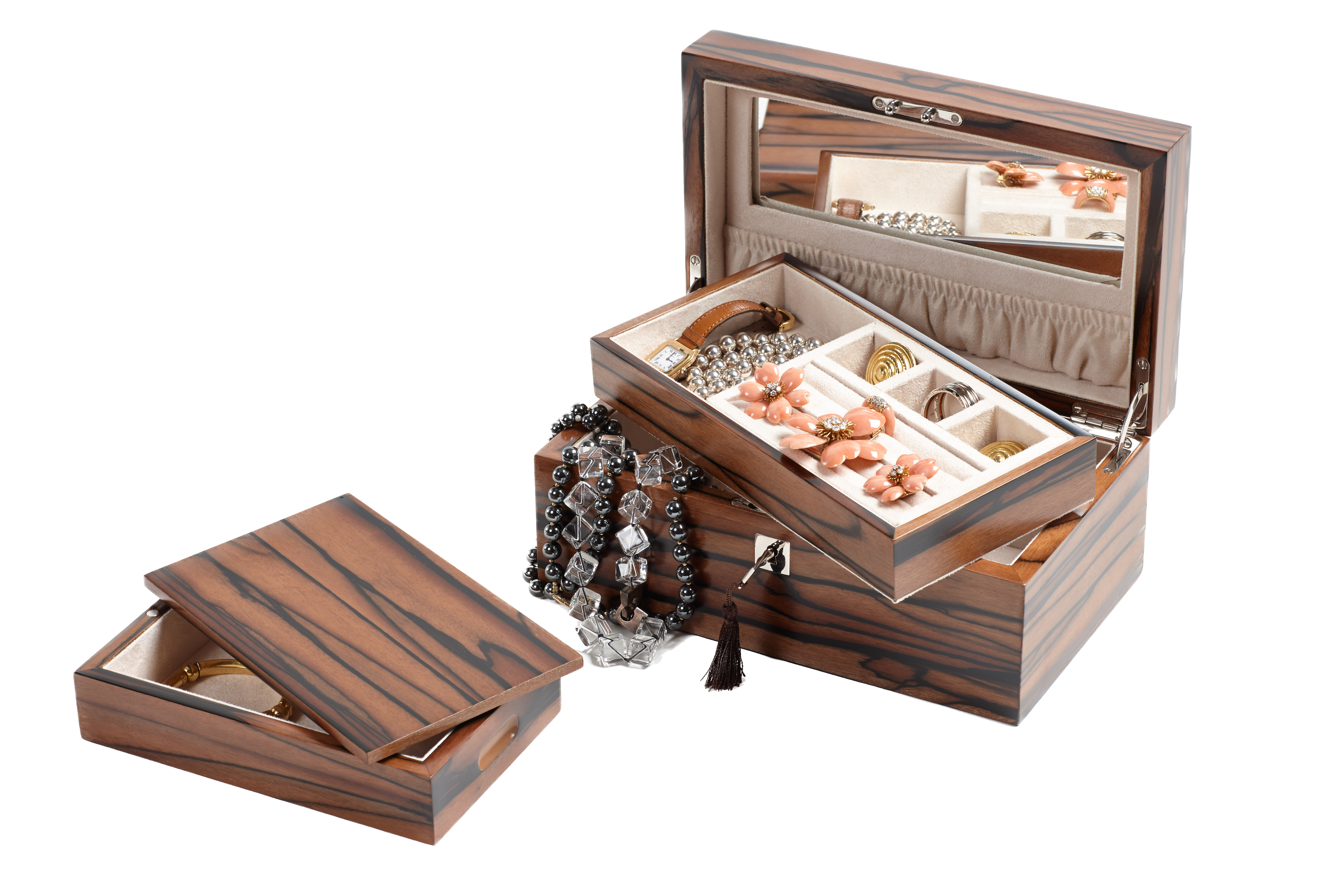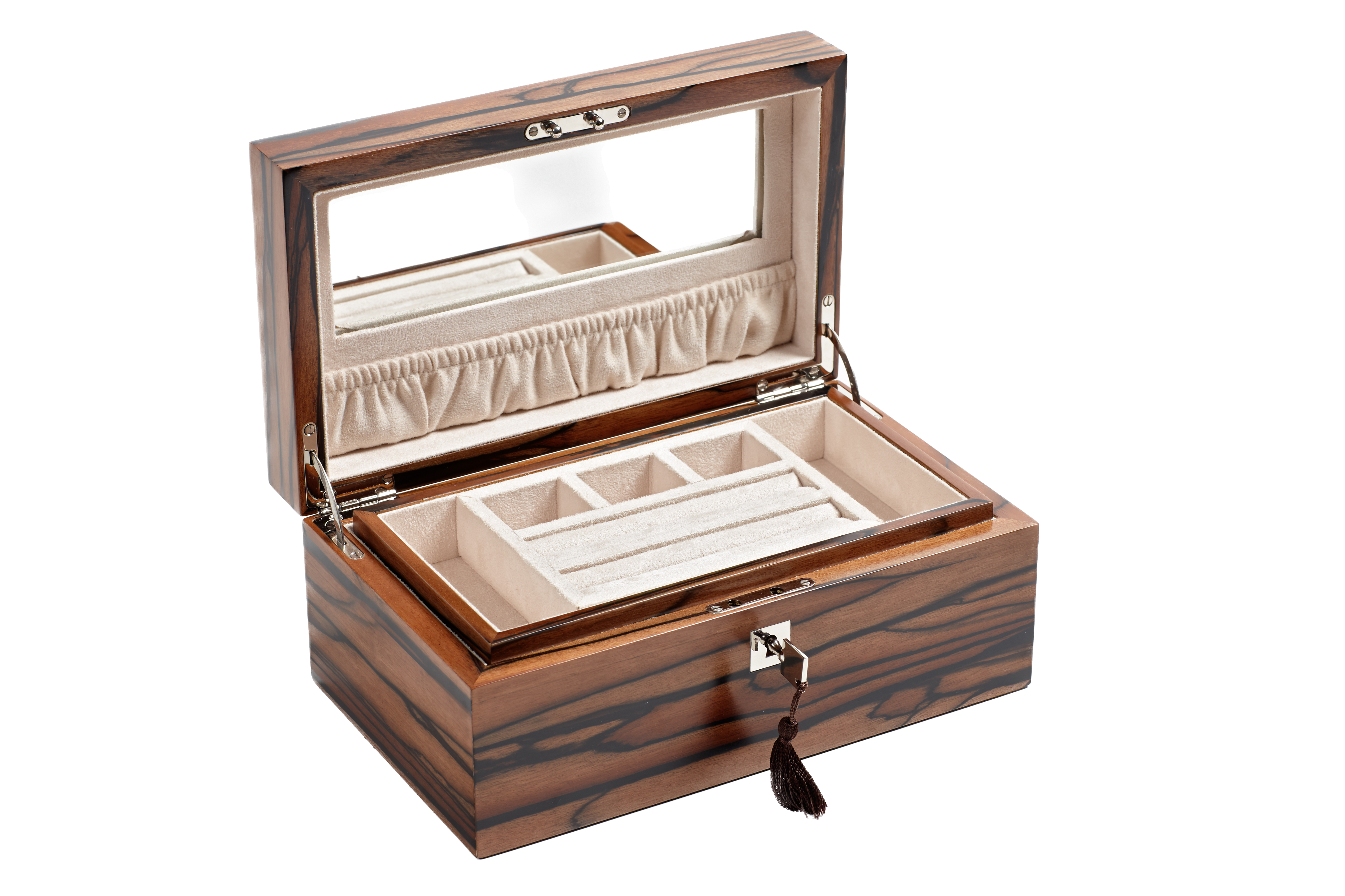 Only a limited quantity can be handmade using the highest quality Royal Ebony Macassar and each jewellery box is unique. Cleverly designed to create two luxury jewellery boxes in one, there is a versatile lower jewellery box which can also be used for travelling, fitting perfectly into your hotel room safe. There is a removable top tray, an internal mirror and two beautiful tasseled keys. The tray and boxes are all lined in cream suede. With its stylish looks, this super luxury jewellery box provides an elegant way to display your favourite jewellery collection.