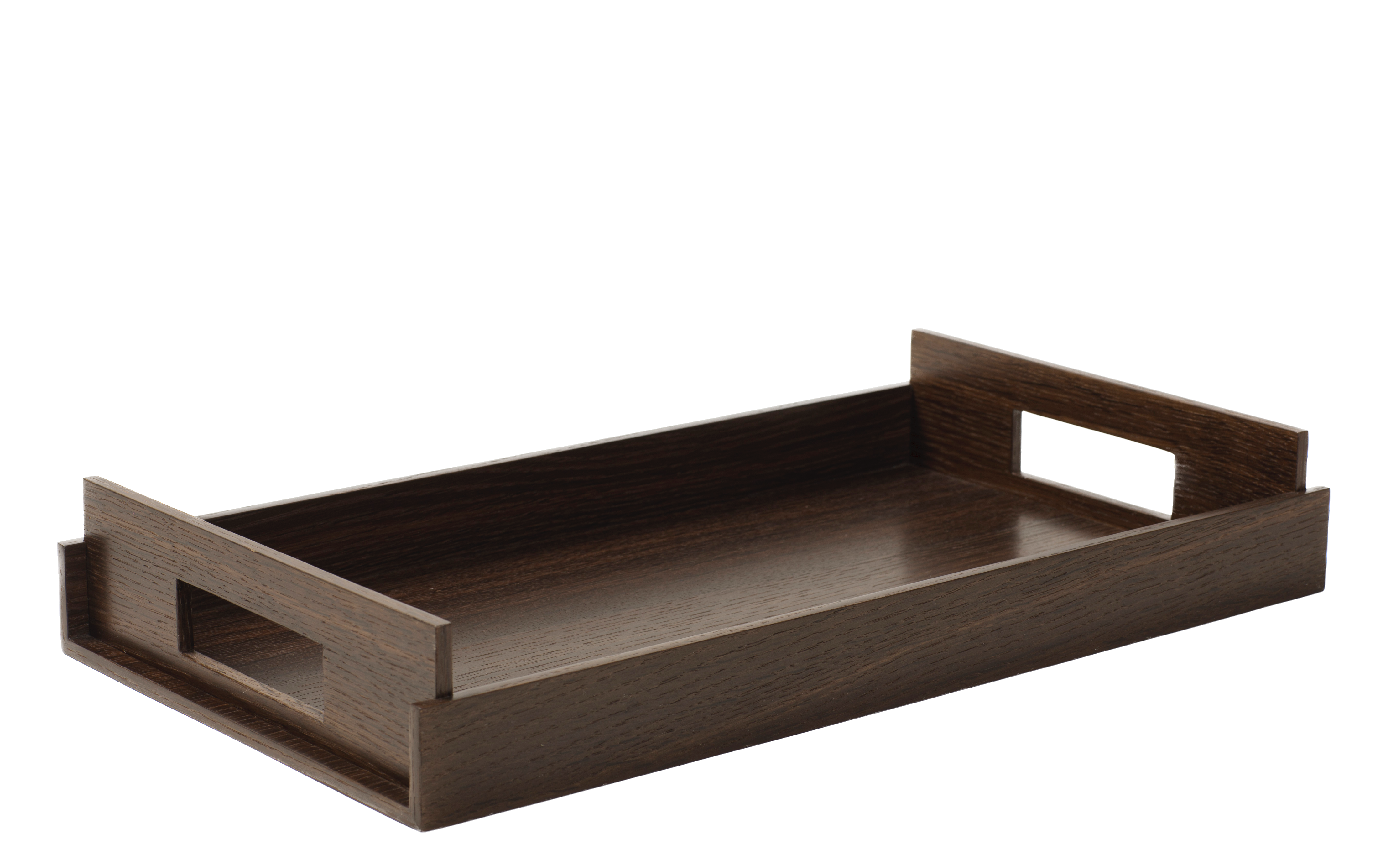 Luxurious wood finish. These trays are easy to lift, handles on either end, and light in weight. Available in three sizes.