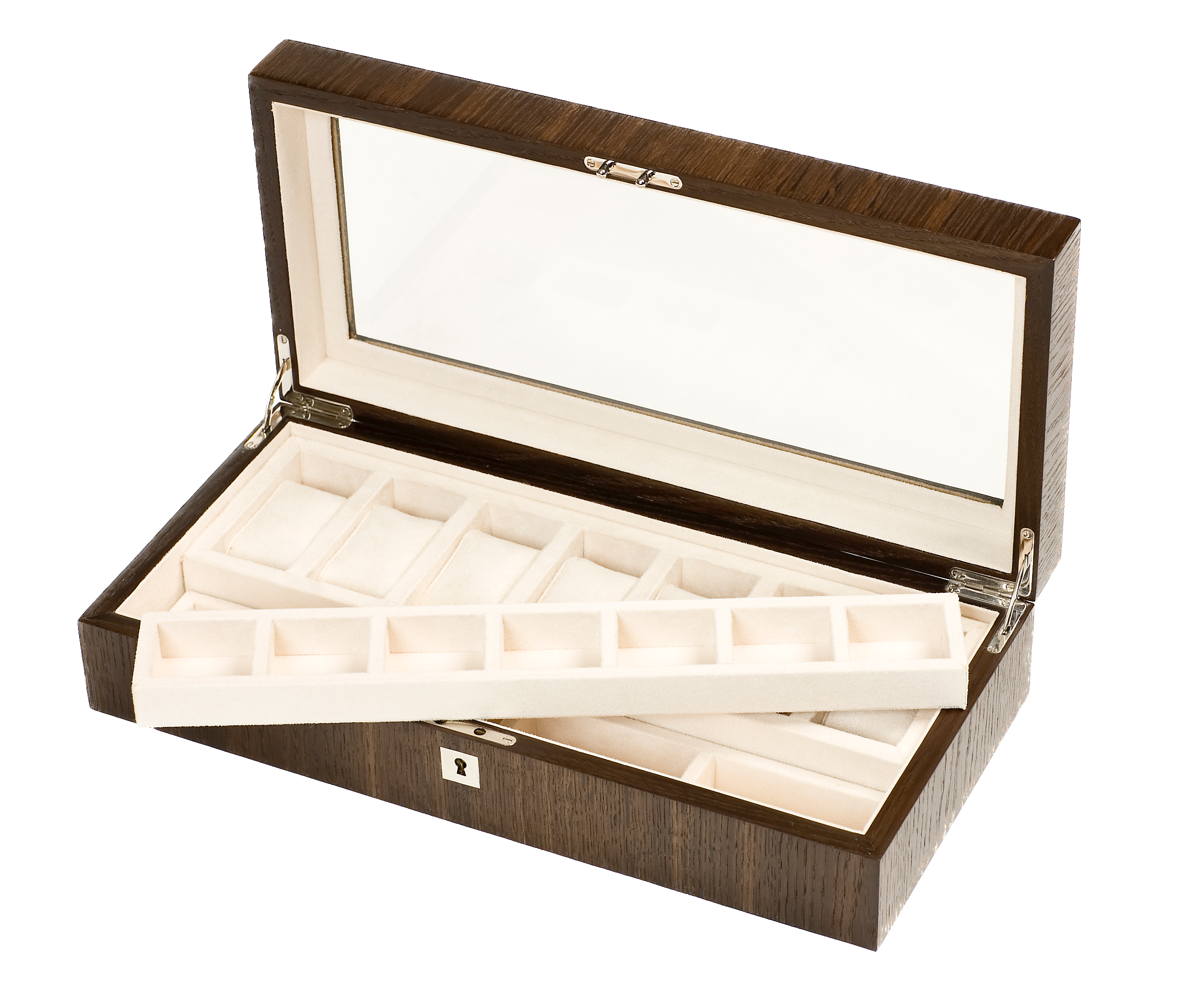 There is a two-level tray to place and match your rings, cufflinks and other dressing accessories with your watches. The box is lined in faux suede and includes two tasseled keys. Superior quality nickel plated hinges and hardware are used.